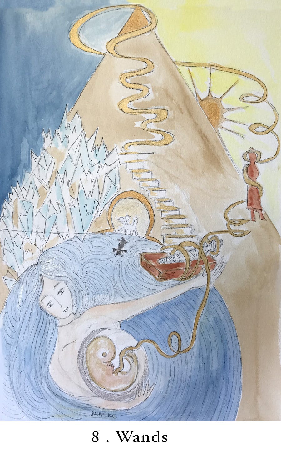 Janet Piedilato, Eight of Wands, “Tarot of Dream and Vision.” The cycle of life, the Hope of the fetus to the rising spirit of the Ascended. The sun upon the horizon, Hope, the first light of Advent.