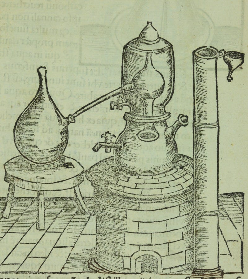 Philippus Ulstadius, detail from “Coelum philosophorum, seu De secretis naturae liber / Philippo Ulstadio Patricio nierebergensi authore,” Argentorati : Arte et impensa Joannis Grienynger, 1528. Ulstadius called for a balneum Mariae, or bain Marie;, named after Maria Prophetissa, the ancient alchemist. The image displays a jacket of cool water surrounding an alembic (condenser). From the physical to the metaphysical, the rising of consciousness to a higher state, enlightenment, the alchemical goal.