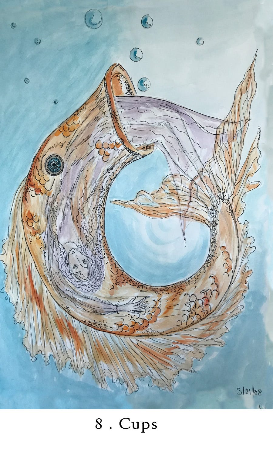 Janet Piedilato, Eight of Cups, “Tarot of Dream and Vision,” diving into the depths, finding truth in the gold that dwells in the great sea of the unconscious, the hidden truths that lay beneath the seen.